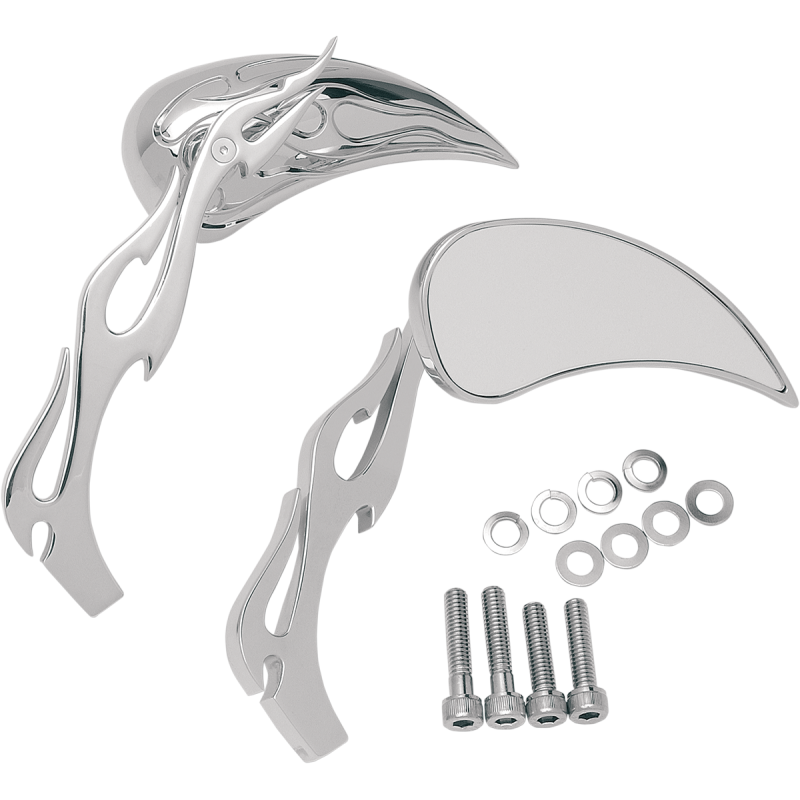 Cool teardrop head with 3-D flames in a chrome or matte black powdercoated finish. Mirror heads measure 5 1/4" W x 2 1/2" L; sculpted flame stems measure 6" L. Matching mounting hardware included. Sold in pairs. NOTE: Require mirror adapters PART #s DS-302148/DS-302149/0641-0096; sold separately, see page 450.