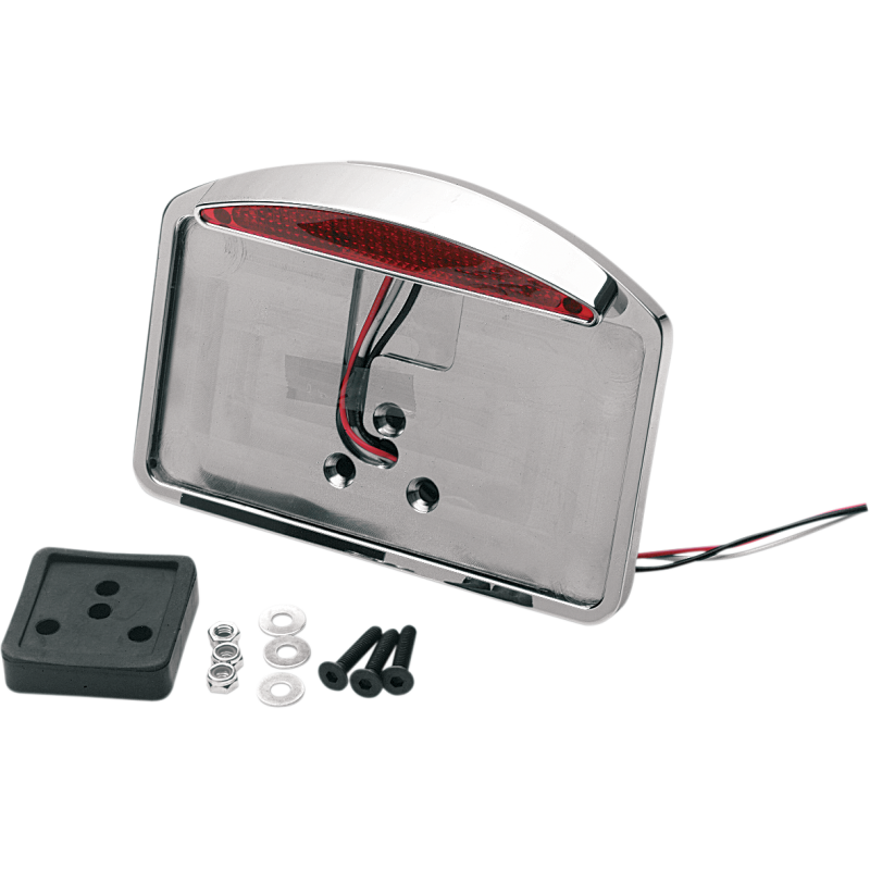 CNC-machined aluminum with a chrome finish. Dual-function design with LED. Accepts most 4" x 7" plates. Includes rubber mounting block and hardware. Fits most fenders (except bobbed fenders).