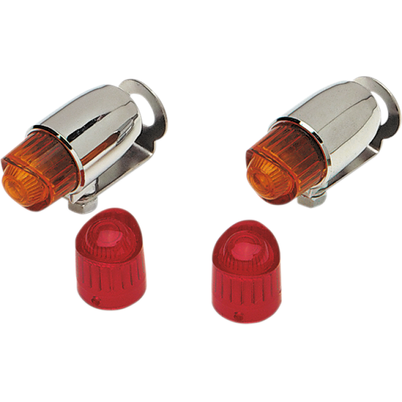 Miniature chrome marker lights feature bottom-mount universal brackets. Round lights dimensions: 2 1/4" L x 3/4" H. Includes red and amber lenses. Sold in pairs.