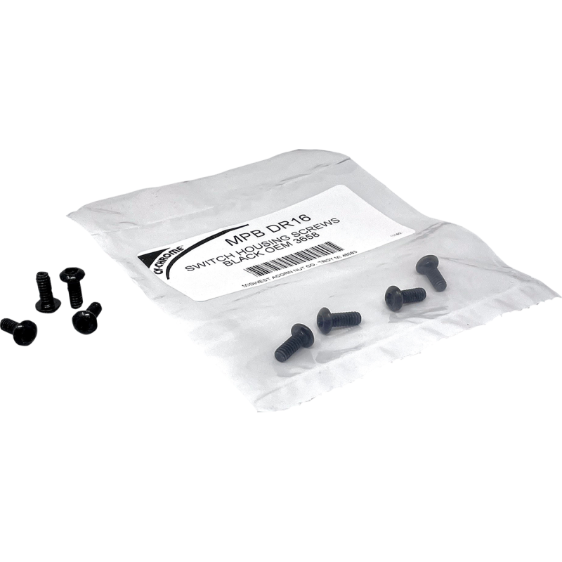 Complete set of switch housing screws in one pack. Available in chrome-plated or black zinc nickel-plated finishes for corrosion resistance. Contains 10-24 x 1/2" screws; repl. OEM #3658.
