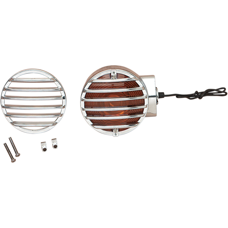 Dress up any OEM flat-style turn signal with these beautifully chrome-plated molded plastic lens grilles. Universal mounting method allows the same grilles to be mounted to horizontally or vertically mounted lights. Includes necessary mounting screws. Sold in pairs. NOTE: Will only fit OEM-style turn signals (not aftermarket).