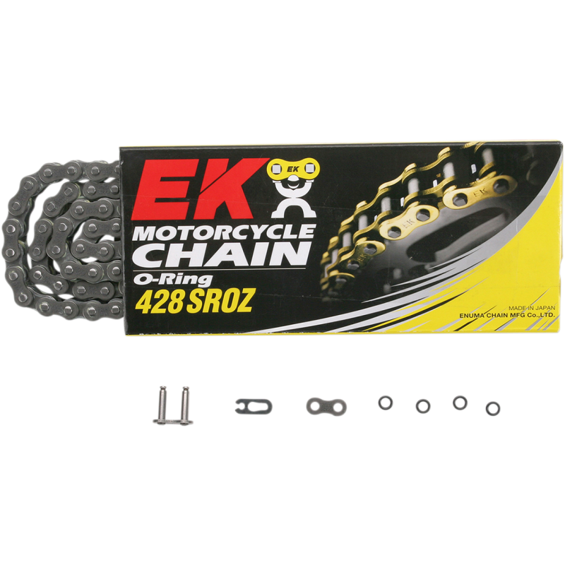 Value O-ring chain that doesn't compromise quality or durability. High-tech heat-treated steel alloy construction. 420 SRO/428 SROZ chains include semi-press fit clip connecting link. 520 SRO6 chains feature lightening holes and includes rivet connecting link.
