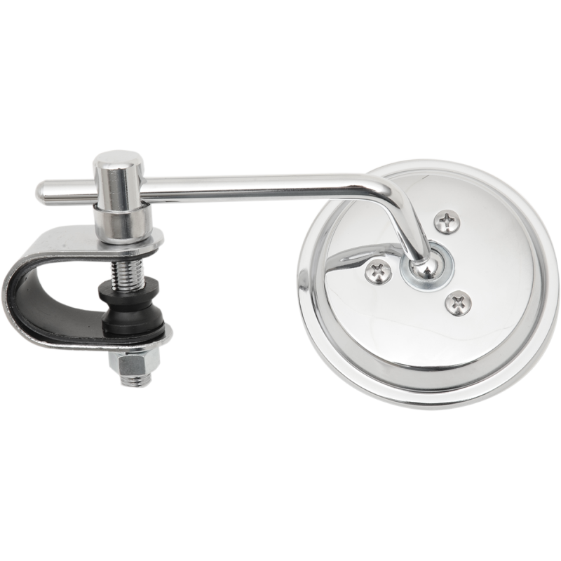 Stamped chrome back with 3" mirror provides timeless look. Fully adjustable for left or right sides. Clamp-style mirrors will clamp on 7/8" or 1" diameter handlebars with included hardware. Sold each.
