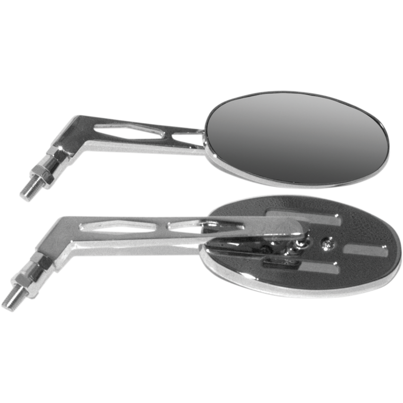 Billet oval mirrors with 10 mm thread. Includes left-hand thread adapter for Yamaha right-side perch. Sold in pairs.