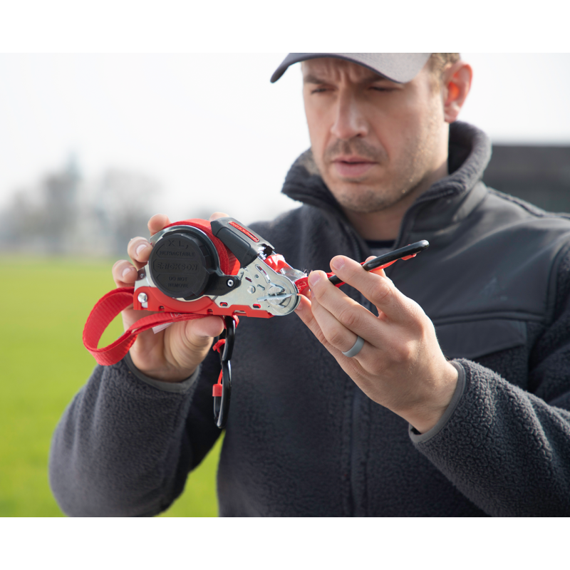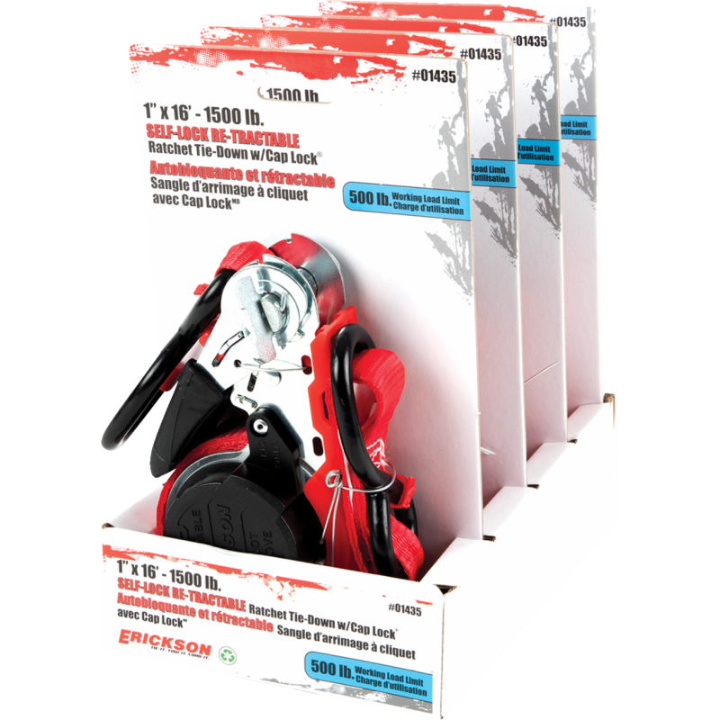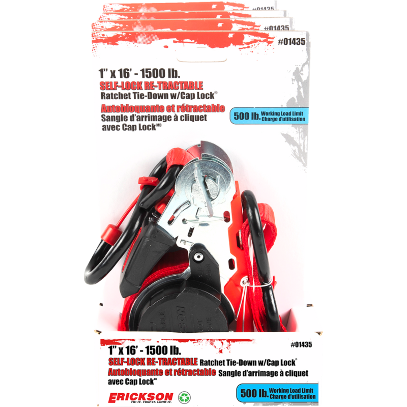 Pre-threaded webbing automatically retracts into housing for clean and easy storage. The Self-Lock device stops webbing from wildly retracting. Features cap-lock hooks, vinyl coated hooks, and molded handles for increased comfort and grip.