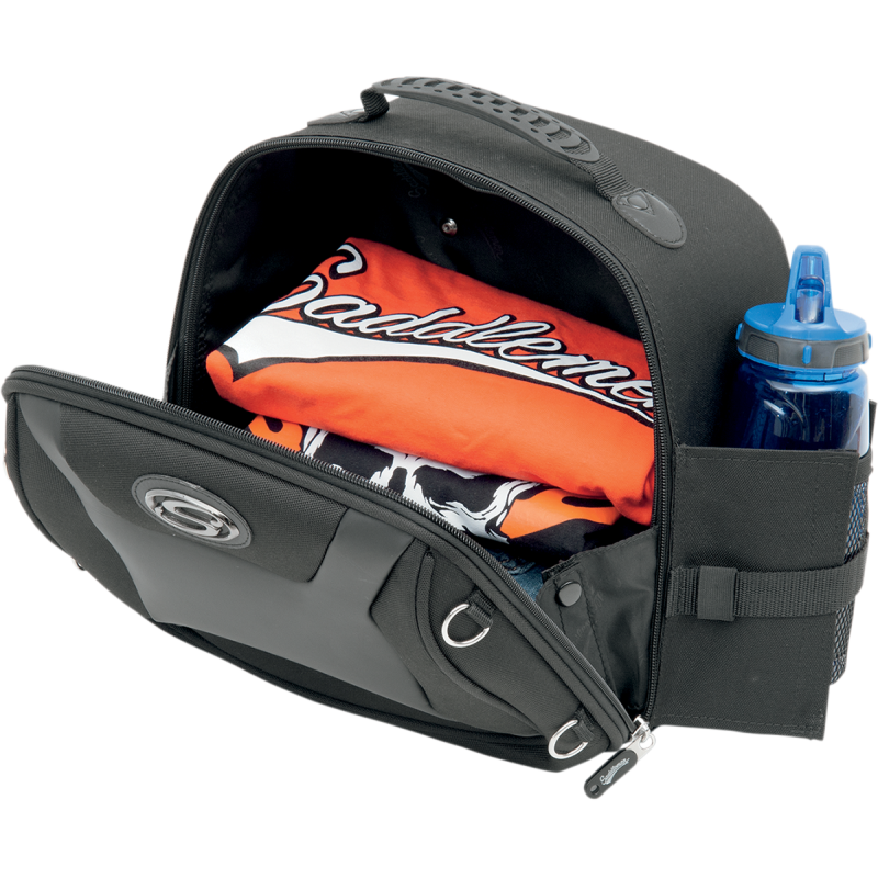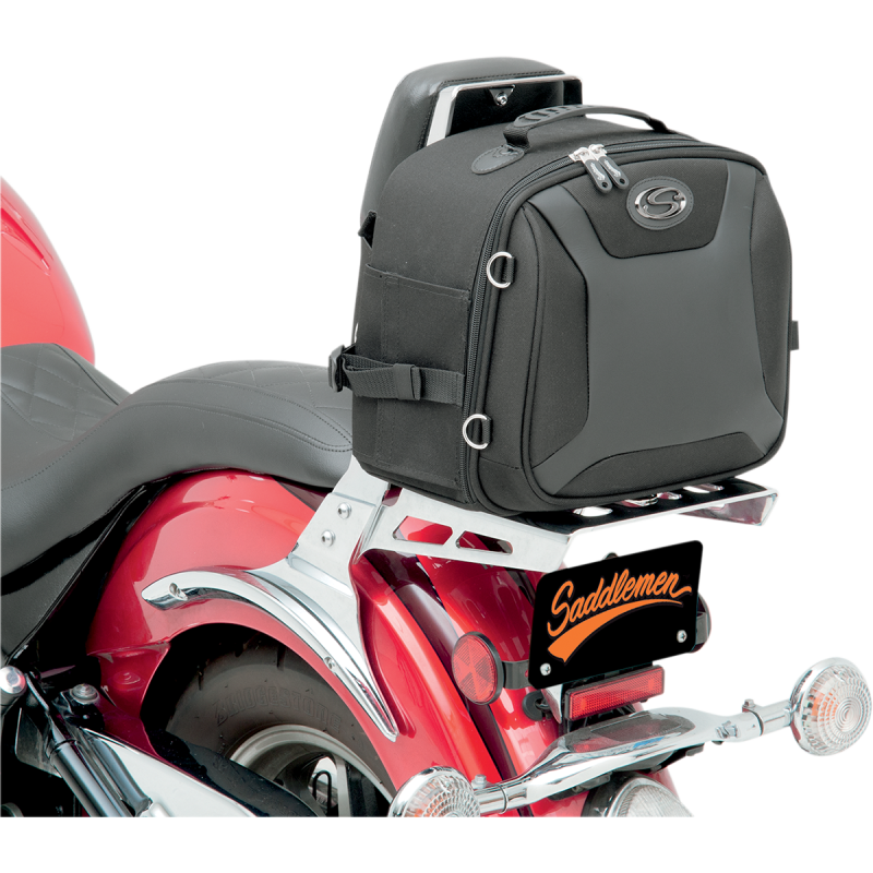 Compact sport sissy bar bag with integrated side-mount beverage holders. Includes padded backpack straps and a high-visibility rain cover. Dimensions: 12" W x 9" H x 7" D; capacity 10 lbs.