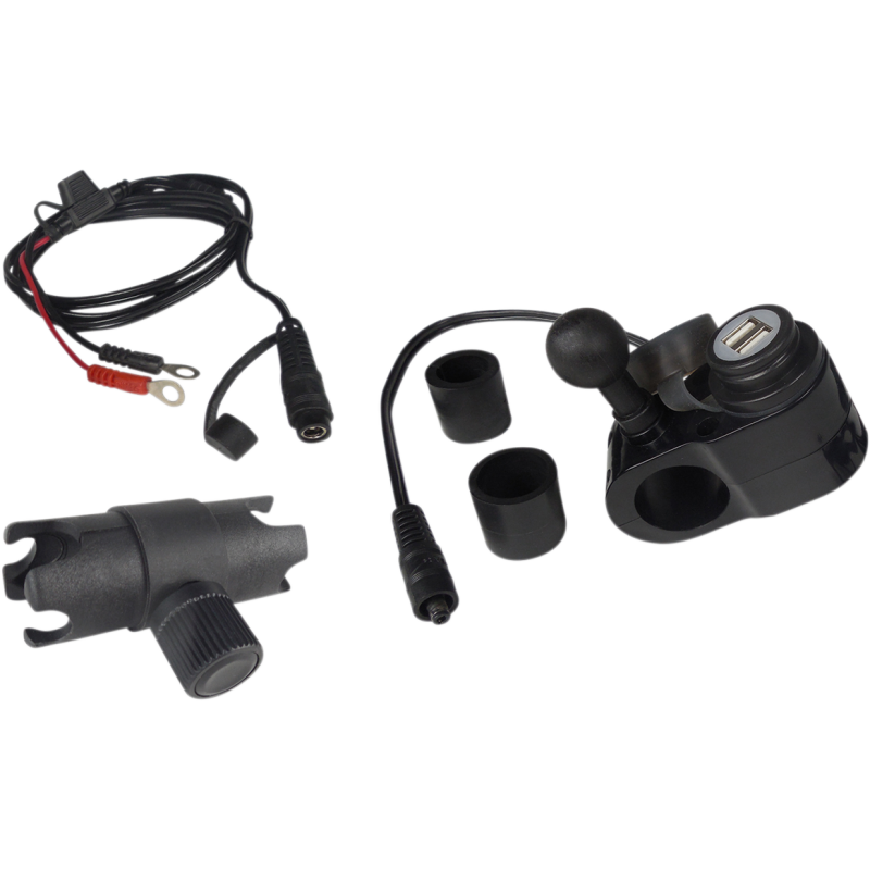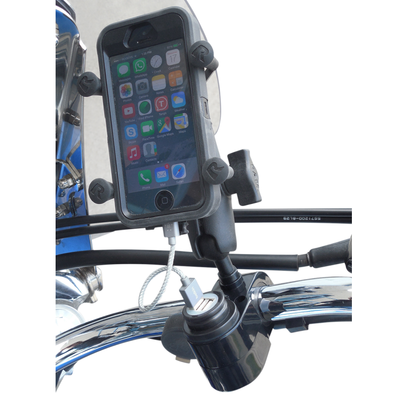 A stylish handlebar mount featuring 5 volt/2.5Amp dual USB ports and a 1" ball attachment for RAM mount accessories. Includes a water-resistant safety cap with a built-in switch to prevent power drain. Can be connected directly to the battery and fits 7/8", 1", and 1 1/4" handlebars with included spacers. The kit also comes with a medium size double socket arm for versatile positioning of devices like smartphones, GPS, and MP3 players.