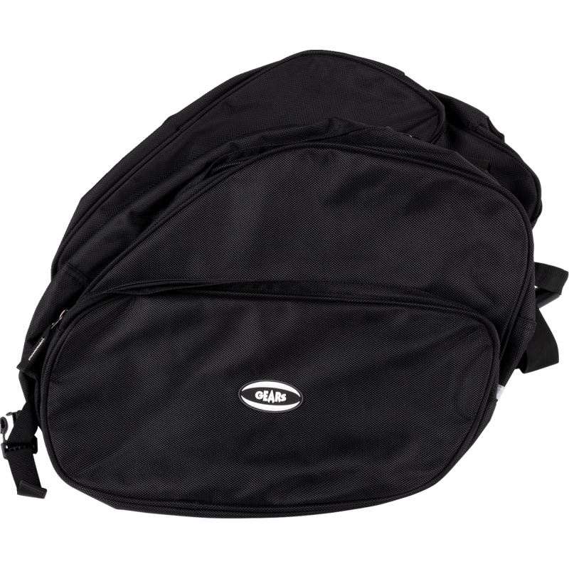 Saddlebags constructed from heavy-duty 1200D Technolast, UV-treated polyester with a polyurethane coating to resist mildew. Features large main compartments with rigid inner supports, rugged rubber handles, long pull tabs, a reflective back strip, and Fastex quick-release buckles.
