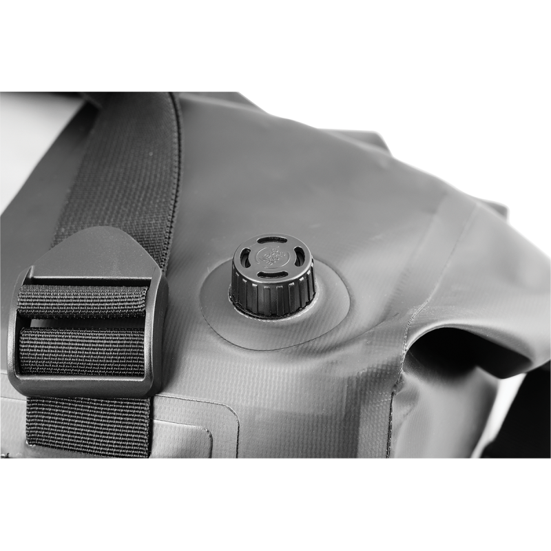 100% waterproof 25 L duffle bag made from PVC Tarpaulin. Features heat-welded seams, watertight roll closure, UV-coated material, and the RIGG STRAP® mounting system. Includes removable internal panels, purge valve, dual-purpose carry/compression handles, and reflective accents. Dimensions: 17" L x 9" W x 10" H.