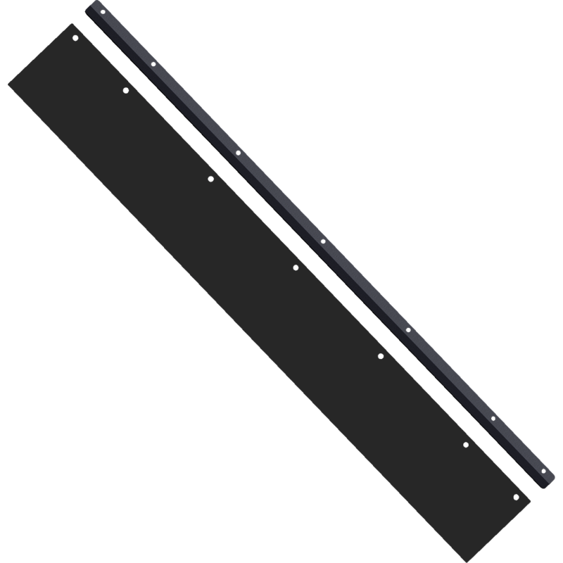 Two-way adjustable snow plow flap kits to increase blade height and control snow flow. Kits include an 11ga steel edge strip, a 6.5" rubber flap, and all mounting hardware. Replacement hardware is also available.