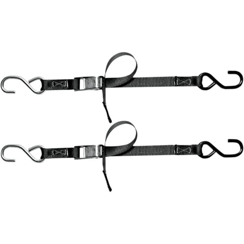1" x 5' Tie-Downs. Features zinc-plated corrosion-resistant S-hooks on one side and vinyl-coated scratch-resistant S-hooks on the other. Includes an aircraft cam buckle for fast and efficient locking with a press-and-release mechanism.