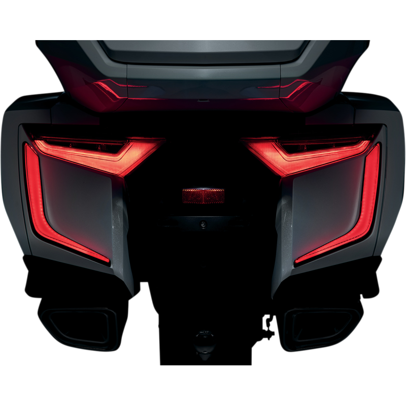 Accents that flow with the outside and lower edges of the saddlebags' rear surface, adding intense auxiliary run-turn-brake illumination. Provides red run/brake and amber turn signal functionality. Styled to match stock lighting components. Requires Plug-n-play wiring adapter (sold separately).