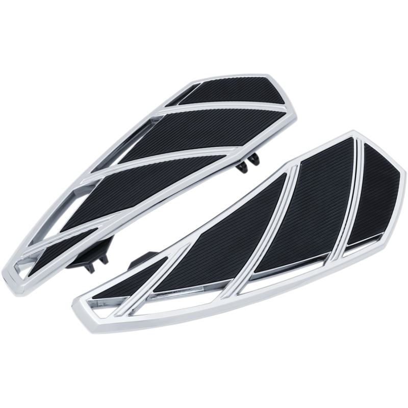 Direct replacements for H-D Touring and FL Softail OEM driver floorboards. Constructed from A380 aluminum with durable EPDM rubber. Sculpted angular design.