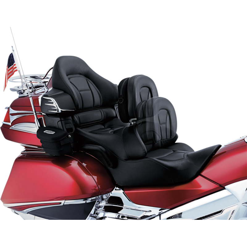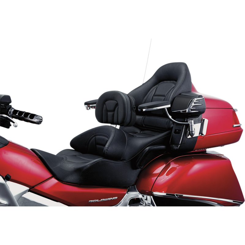 Driver backrest with front, rear, and vertical adjustments for perfect comfort. Features a removable pouch for essentials, an extra-wide mounting base, and detaches quickly. Measures 13" W x 10" H x 4 1/4" D.