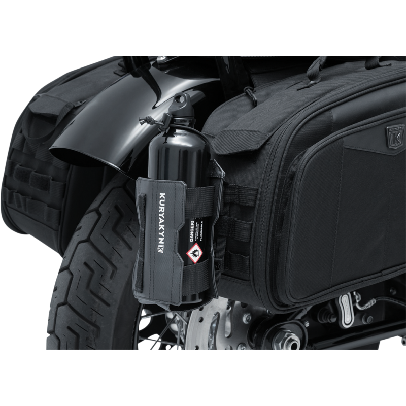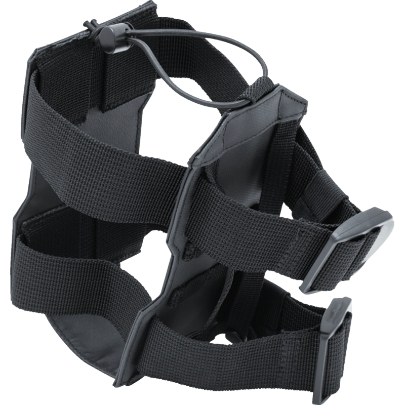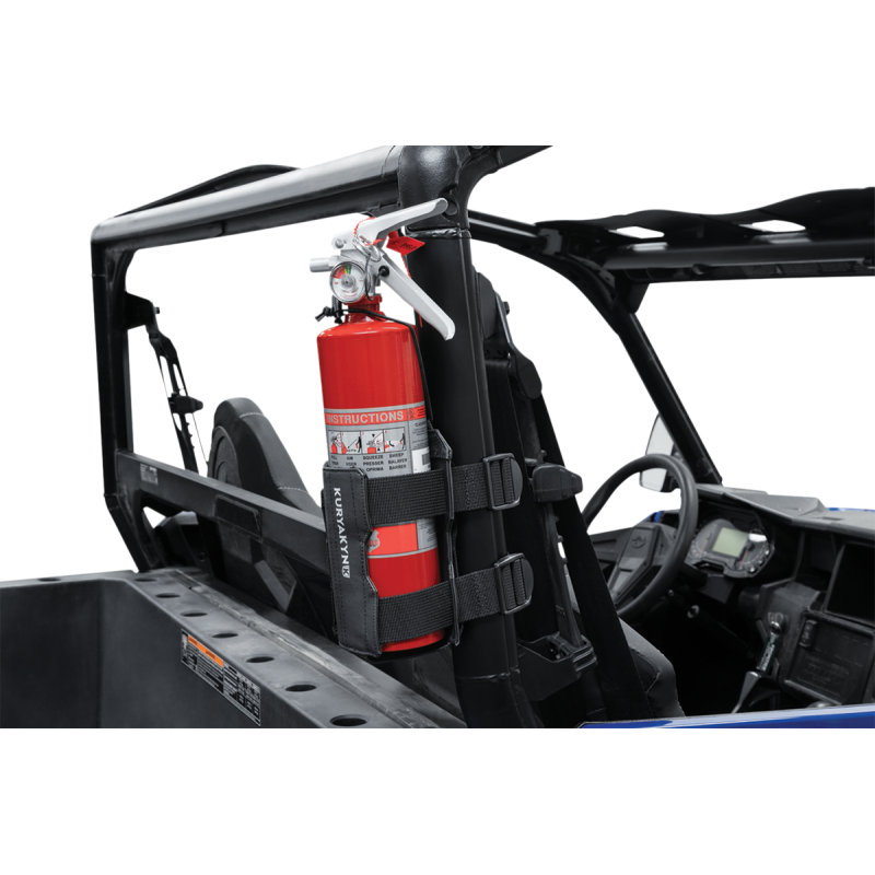 A versatile bottle holder that can hold water bottles, fuel bottles, or fire extinguishers up to 3 1/2" in diameter. Can be attached via cinch buckles to roll bars or woven into an existing MOLLE field. Features non-slip PVC fabric and an elastic cord for security.