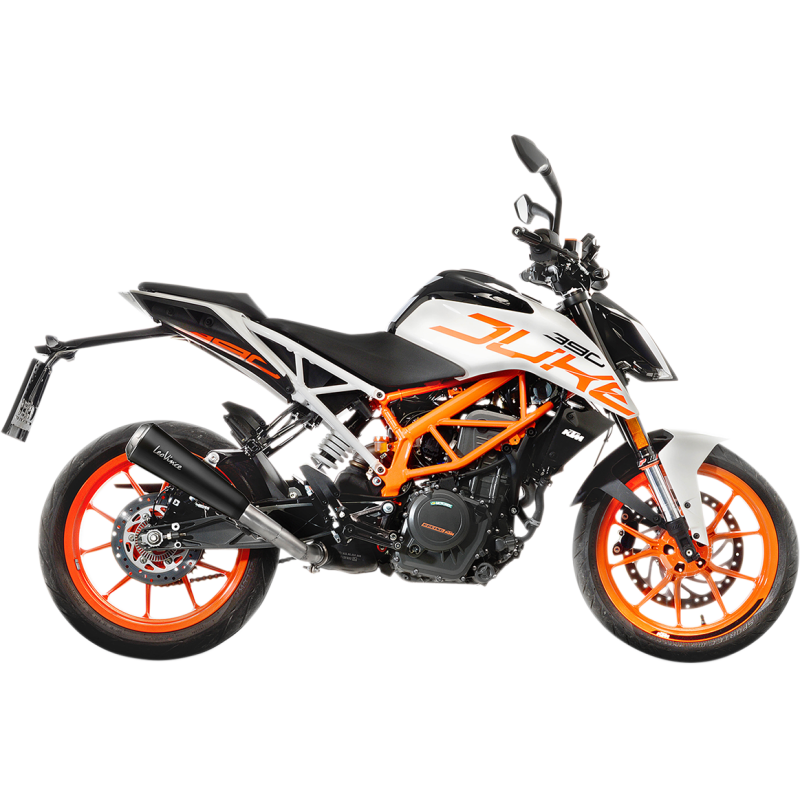 Made from AISI 304 stainless steel with a laser-etched Leo Vince logo. Features a matte black finish with a sandblasted end cap. Made in Europe.