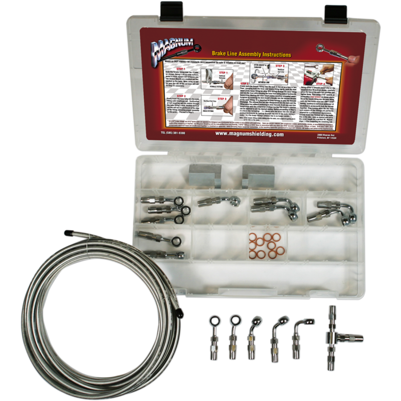 A complete kit to build multiple brake lines. Design meets all FMVSS-106 standards once assembled. Assembles in 5 minutes with only side cutters and 7/16" wrench. The kit is organized in a labeled, compartmental carrying case and includes 25' of non-yellowing clear coated braided stainless steel hose, chrome plated banjos, polished stainless hardware, copper crush washers plus a set of durable Aluminum BYO® Vise Jaws. For non-ABS applications ONLY.