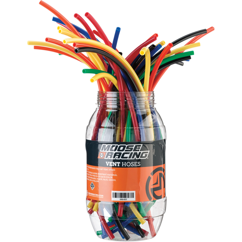 18" polyurethane fuel cap vent hoses. Soft, flexible and kink-resistant material. 54 piece tub; nine pieces of each of six colors (black, blue, green, orange, red and yellow). Sold each. Made in the U.S.A.