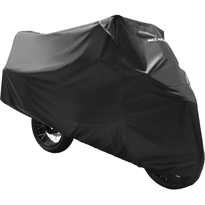 A half cover for touring and adventure bikes, featuring an elastic hem and sewn-in bungee straps for a snug fit. Packs into an integrated carry bag.