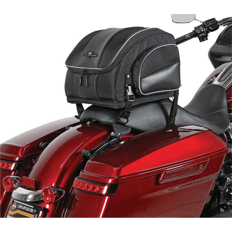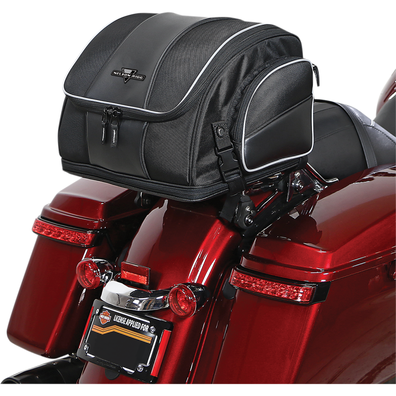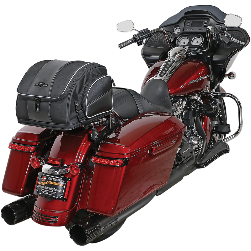 Made from industry-leading UltraMax™ fabric. Mounts to luggage/tour trunk racks, sissy bar or seat using quick-release and hook-and-loop straps. Fully expandable to hold one full-face helmet. Features two outer pockets, rigid construction, reflective piping, and an included waterproof rain cover. Main compartment dimensions: 14" L x 13.5" W x 10" H (31 L), expanded: 14" L x 13.5" W x 13" H (40 L).