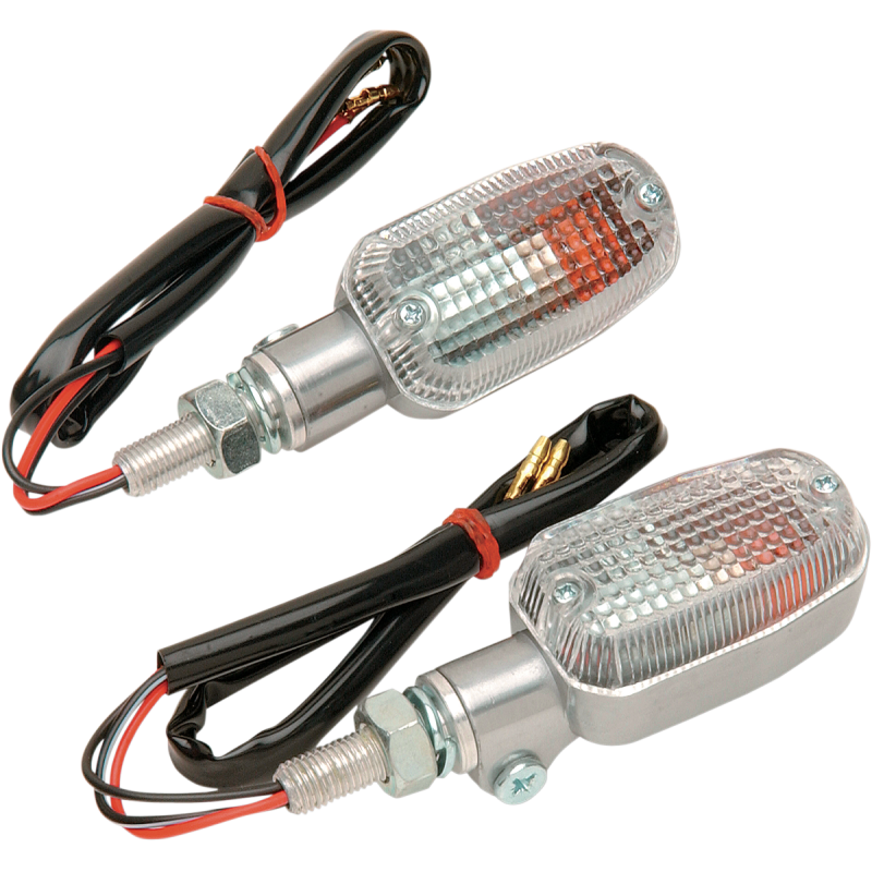 Clear lens, dual filament. Oblong - 63 mm W x 35.5 mm H lens; 83 mm overall length; 10 mm mounting stud.