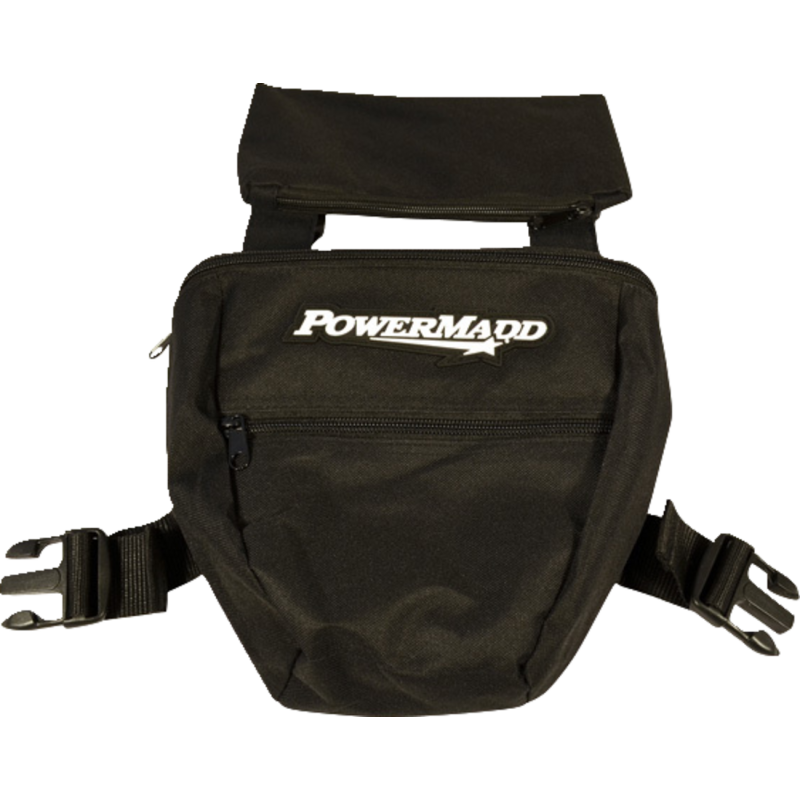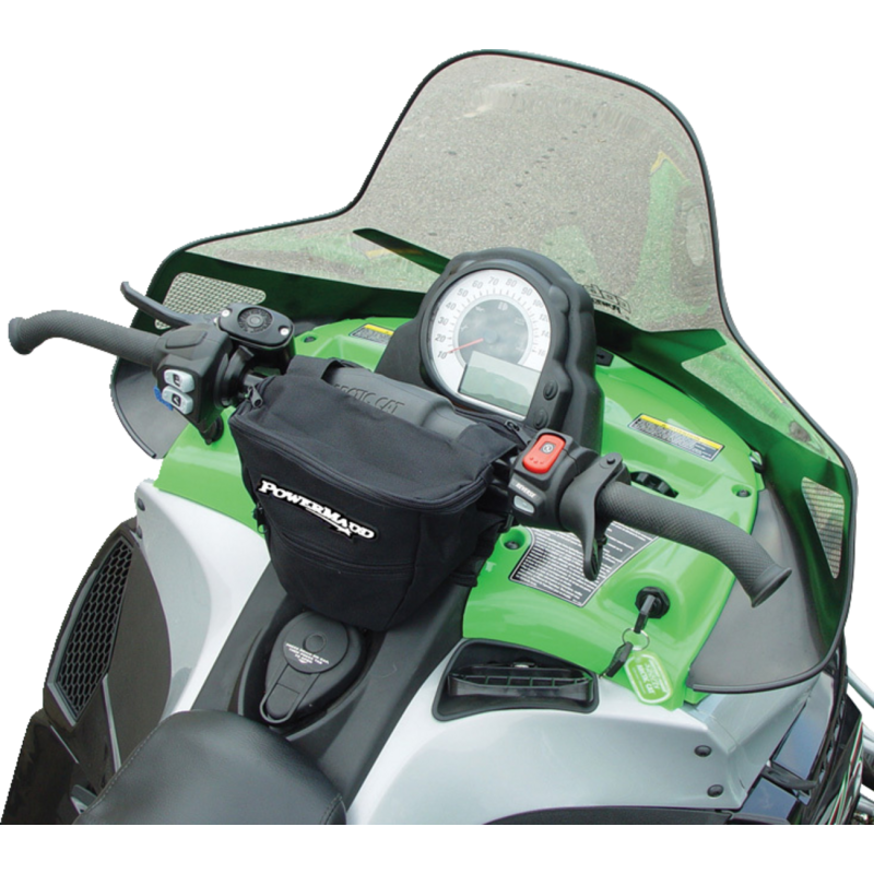 Handlebar storage bag that attaches with hook-and-loop straps. It is shaped like a hat for clean, wrinkle-free storage and includes two zippered pockets. The deluxe version features a stowaway map pouch and can also be used as a waist pack.