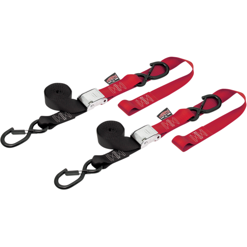 1 1/2" W x 6 1/2' L cam-buckle tie-downs with safety-latch and integrated soft-tye. 6,000 lb. test nylon webbing; 800 lb. working load. Double security stitching and sewn-in soft-tye. Sold in pairs. Made in the U.S.A.