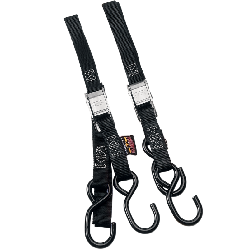 1" W x 5 1/2' L tie-downs with industrial-grade PowerTye cam buckle and 3/8" heavy-duty vinyl-coated hooks. Features 4,500 lb. test nylon webbing with a 400 lb. working load. Hand loops for pulling tight and double security stitching. Sold in pairs and made in the U.S.A.