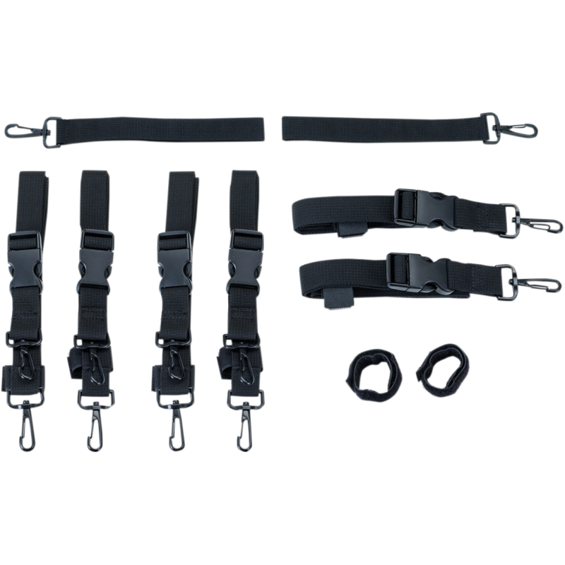 Works with all Kuryakyn and XKursion luggage. Includes four double-snap hooks, two single-snap hook straps with pull-through loop, two hook-and-loop straps and two hook-and-loop snap straps.