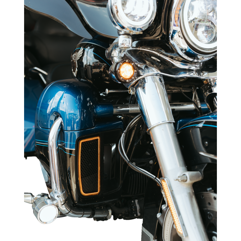 LED replacement for front OEM turn signals. Eight white LEDs embedded into outer aluminum bezel and 12 amber center LEDs. Outer ring operates as running light, center LEDs as turn signal. Plug-and-play. Available with gloss black or chrome bezel with smoke lens.