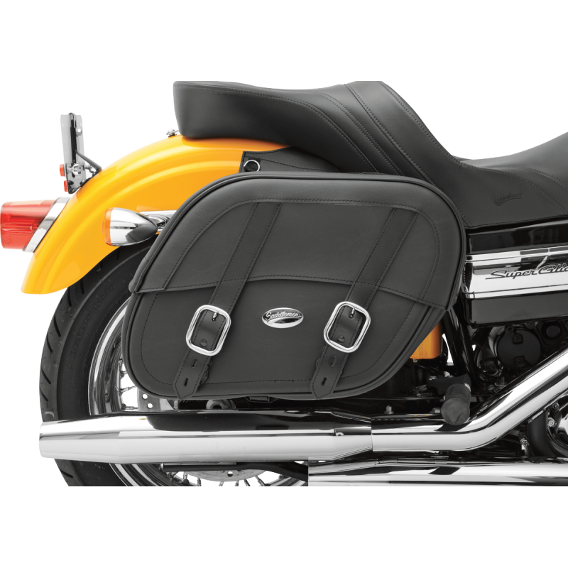 Contoured backside allows fitment directly over most shock absorbers, allowing saddlebag options on bikes that were previously limited due to shock and turn signal placement. Clean-styled saddlebags feature chrome buckles and genuine leather straps with lockable, quick-release hidden buckles. Install using one of three methods: zippered yoke for over-the-fender mounting, hard mount bags using S4 saddlebag supports (sold separately) or use with Saddlemen's S4 Quick Disconnect Mounting Kit (sold separately). Zip-off yoke mounting allows bag to be disconnected without removing the yoke.