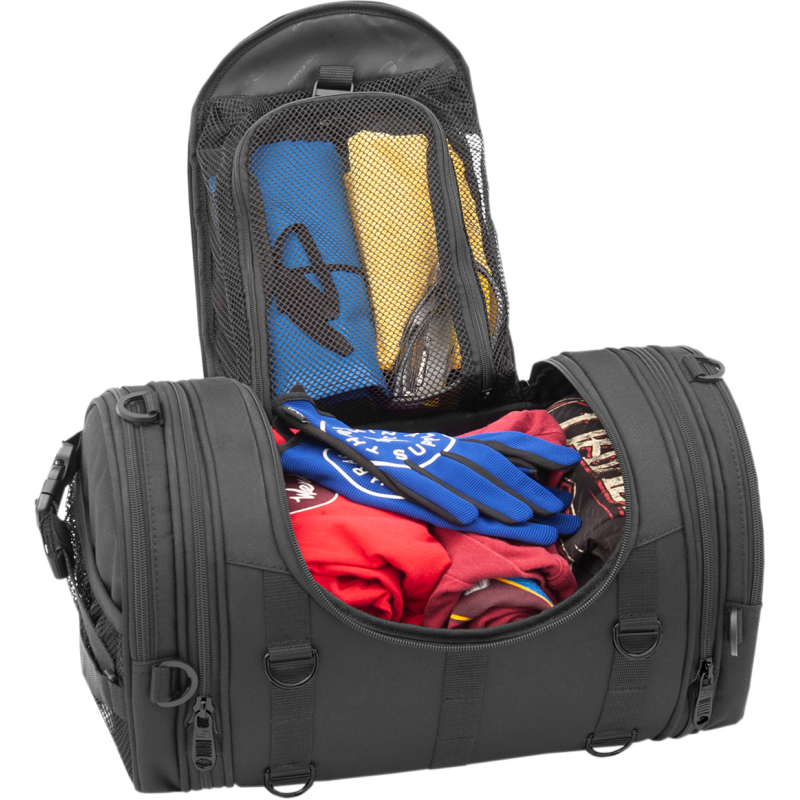 Wide zippered center opening assures ease of loading. UV-rated, weather-resistant 1200D chassis. End pockets expand out, providing additional packing room when needed. Internal zippered mesh pockets keep items organized. Maintains shape even when empty. Easily mounts to sissy bar, plus full mounting strap kit offers a variety of mounting options. All strap ends include unique keepers system, which eliminates the need for cutting after the bag is installed. Multiple heavy-duty D-rings for additional mounting or attaching options. Integrated MOLLE modular attachment points for storage customization. Includes removable shoulder strap and carrying handle for transportation ease. Includes tethered rain cover for added protection from the elements.
