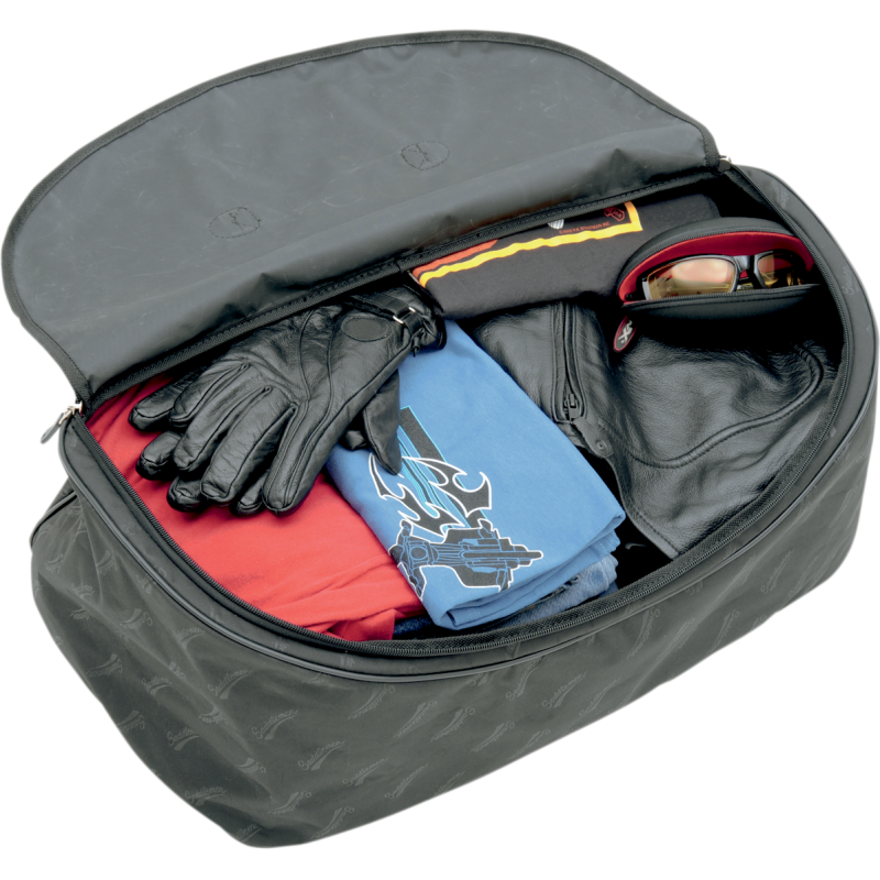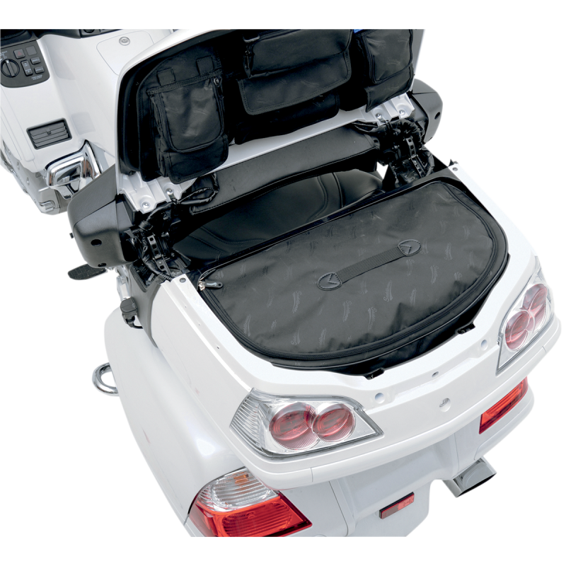 Unique design stores flat when empty and features a full side lid opening so you have easy access to your stuff even when the bag is in the trunk. Simply lift your liner bag out of the trunk to move your cargo easily into the hotel, campground or to unload fast once you're home. Standard soft trunk liner bag is contoured to fit neatly into your GL1800's trunk and matches the appearance of Saddlemen's® Saddlebag Packing Cube Liner Set. Made from durable 150D logo stamped fabric with sturdy zippers.