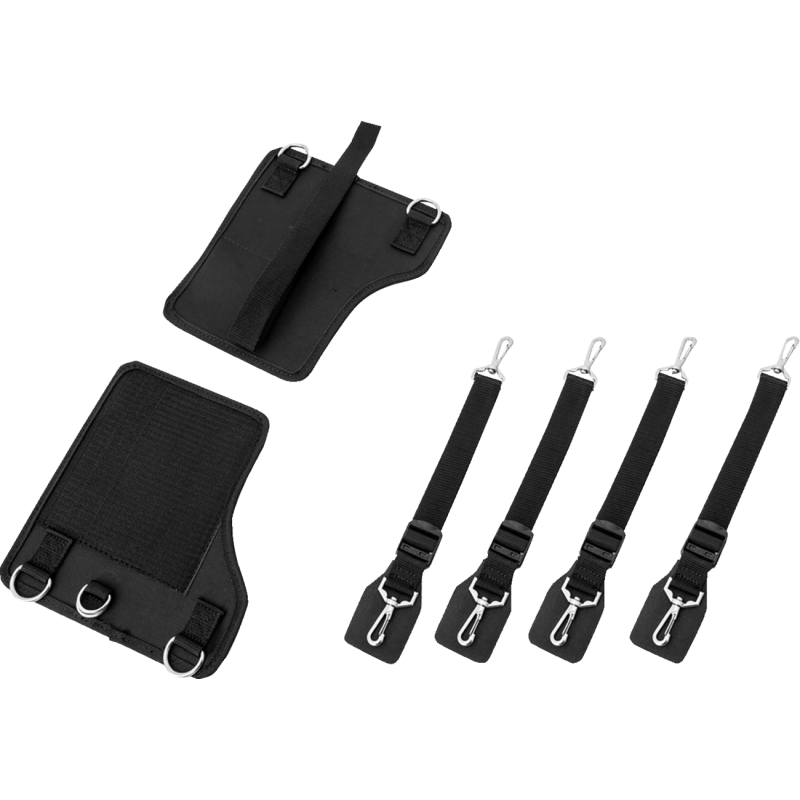 An easy-to-use mounting system designed to fit most one-piece two-up seats. It attaches under the passenger seat area, enabling the use of sissy bar, rack, or seat bags without needing a sissy bar or rack. The adjustable two-piece design allows the yoke to fit various seat widths, while security straps, D-rings, and spring-loaded hooks ensure a stable mount.