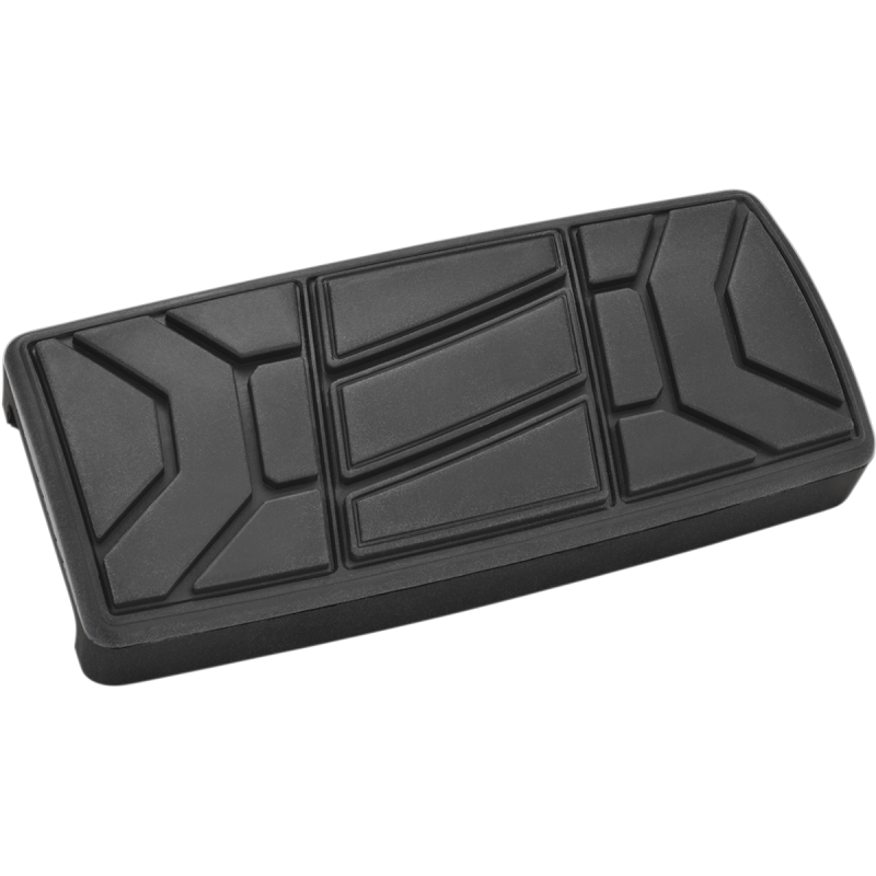 Slides over the OEM unfinished brake pedal with a large 4 1/4" L x 2" W rubber pedal cover. Underlying metal tubing is embedded into the custom patterned rubber and secured with two setscrews.