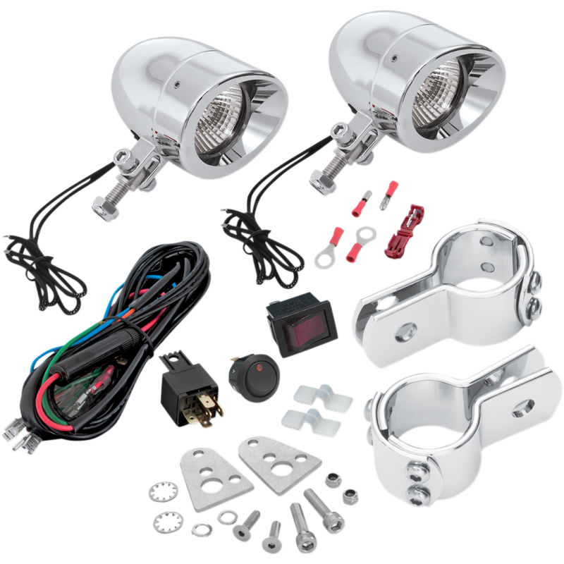 A pair of die-cast 2 3/8" visored mini driving lights available in Halogen or LED. Includes a pair of 1 1/4" highway bar clamps and comes complete with wiring harness and isolation relay. Available in chrome.