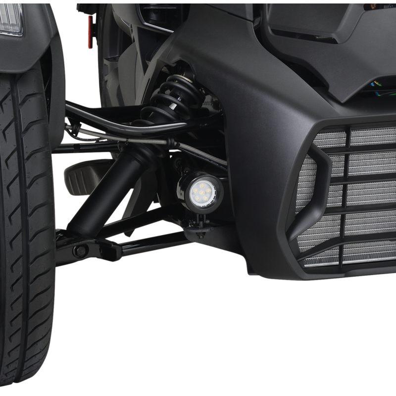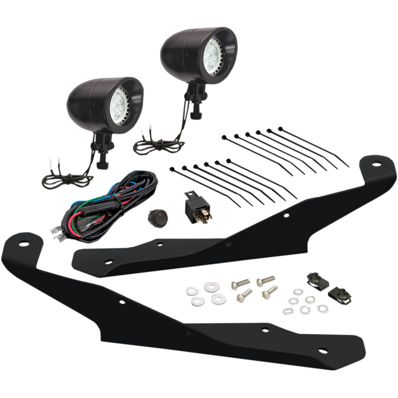 Mini LED driving lights with dimmable hi-output 490 LED. Easy no-drill light brackets mount to existing locations under the front frame cowl. Includes all wiring, relay, illuminated switch and hardware. DOT compliant and available in satin black.