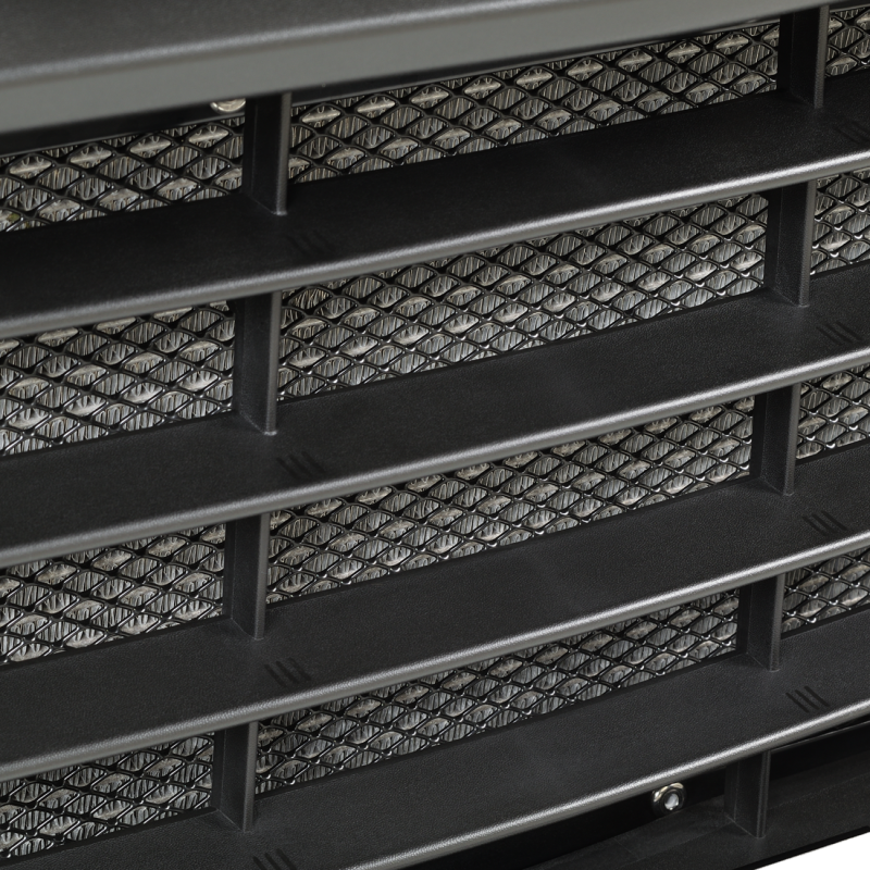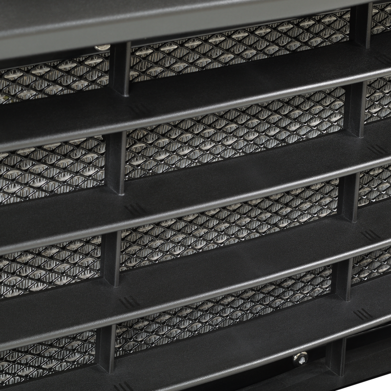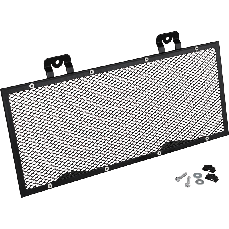 Steel mesh, powdercoated grille covers the entire radiator and lower cowl intake area, replacing the stock OEM plastic covers. Comes complete with all mounting hardware.
