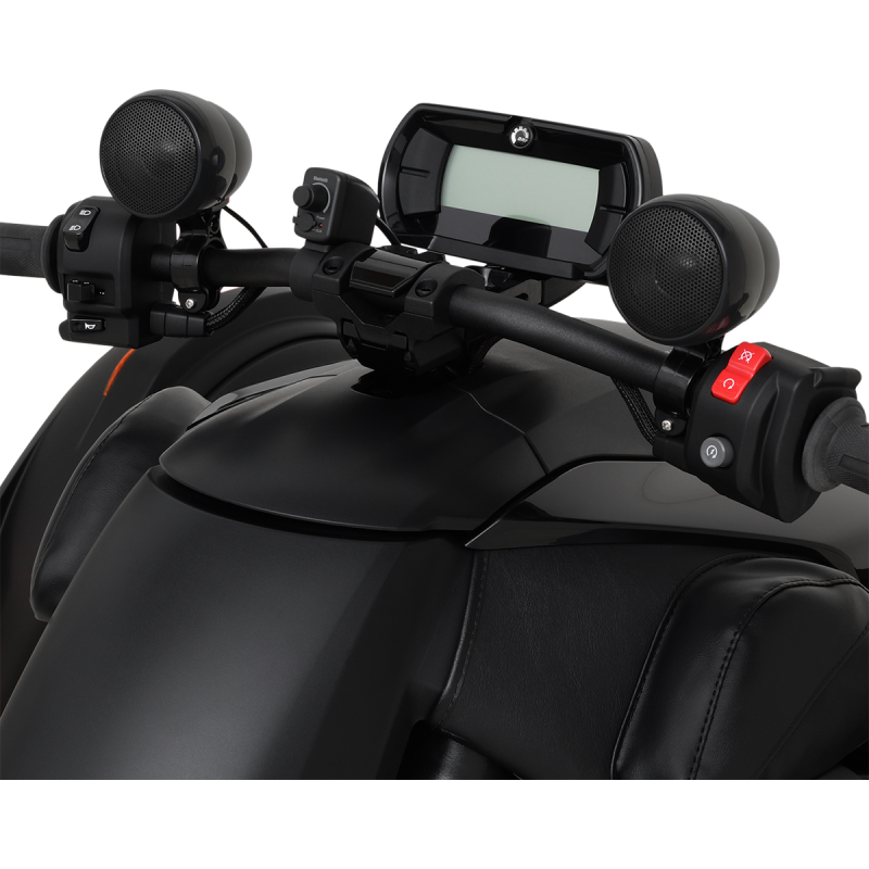 Universal 7/8" and 1" clamps allow rider to mount directly to handlebars and position the sound where they would like it. Custom engineered 2 1/2" speakers provide big sound. Compatible with Bluetooth® version for wireless connection. Available in black.