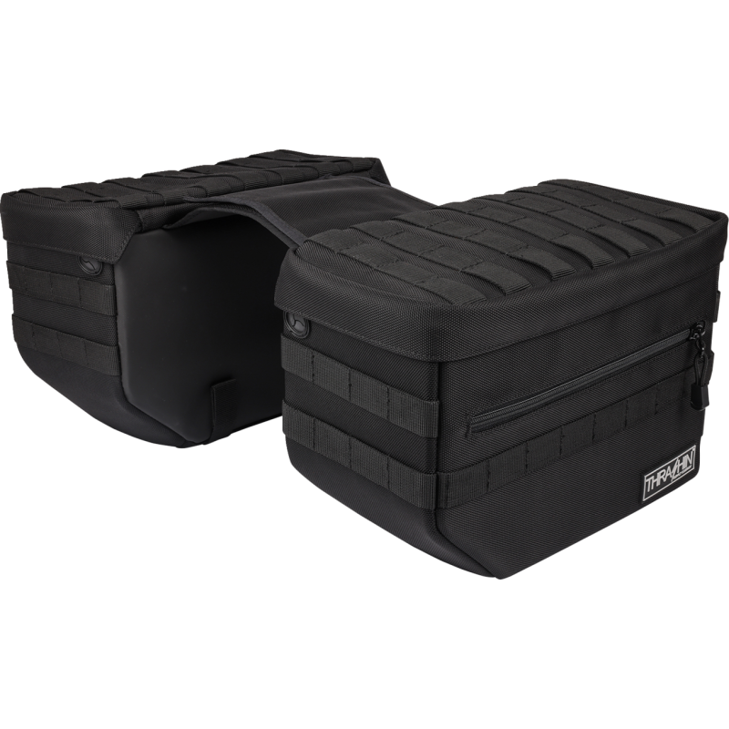 Saddlebags with easy-on, easy-off throw over mounting brackets. Made from 1680D ballistic nylon and structured to hold shape. Includes MOLLE attachments, waterproof cover, and hi-viz interior. Compatible with fixed or detached sissy bars.