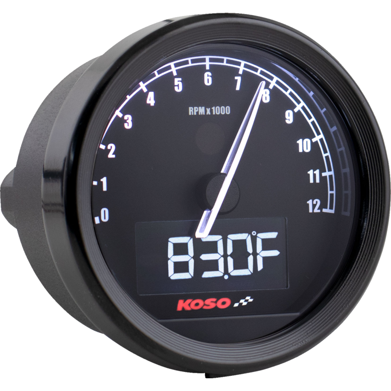 Measures RPM up to 12,000 with a programmable shift warning light. Features gear-specific programming, thermometer, high temperature warning, volt meter, and over-running warning. Comes with a sleek black bezel.