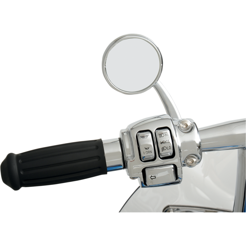 CNC-machined aluminum with chrome finish. 2 1/2" diameter mirror, 4 1/2" total height. Left side mirror, determined as sitting on bike with mirror mounted under handlebar.