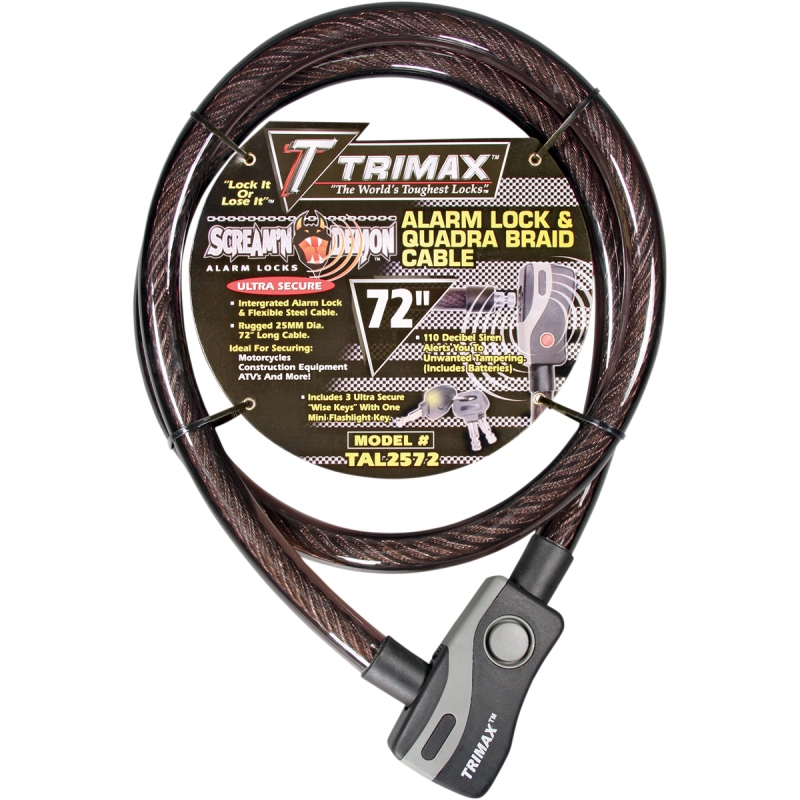 25 mm Quadra-braid cable that measures 72" L. Features push-button activation and weather-resistant housing. Alarm will reset itself.