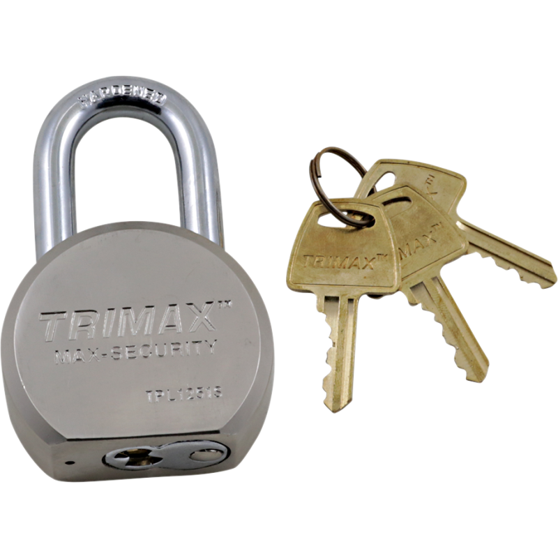 Hardened-chrome steel commercial grade padlocks. Ideal for enclosed trailers, forks, cases with T-Hex™ chain and cargo boxes. 64 mm round body, 1.25" x 11 mm shackle, rekeyable.