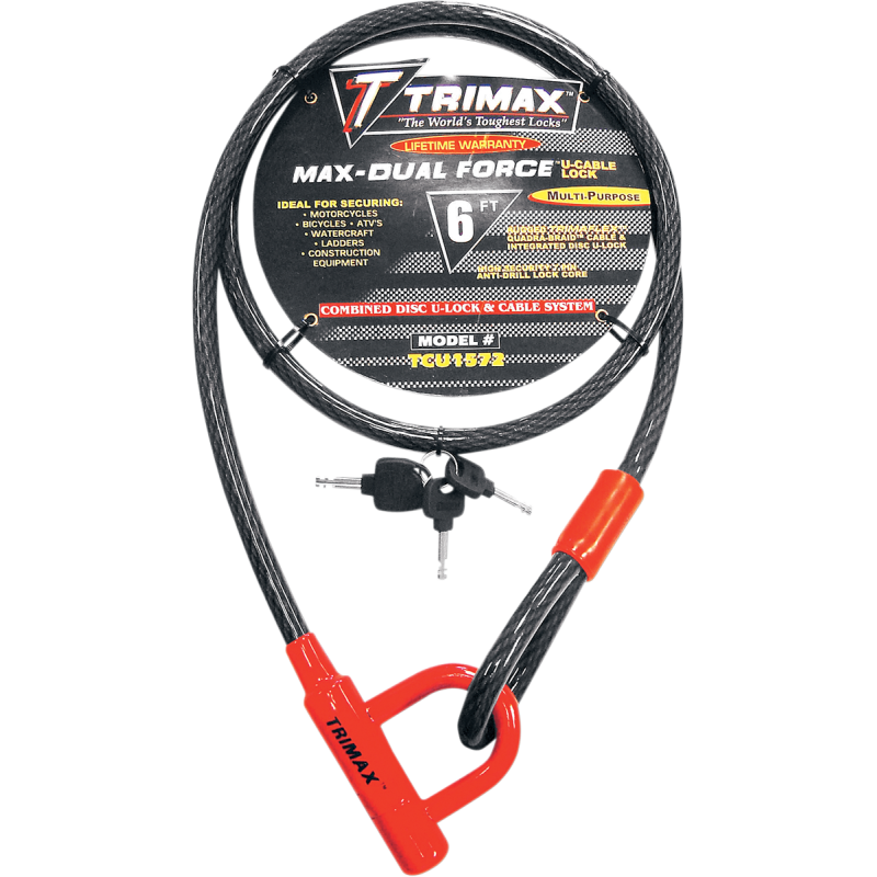 High-strength Trimaflex quadra-braid coiled cable locks with a PVC protective coating. Lock mechanisms are covered in rugged plastic for durability and trouble-free use.