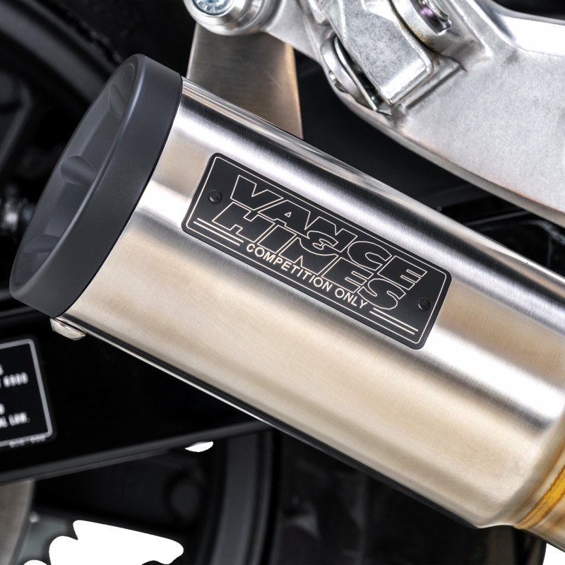 A full exhaust system featuring 304 stainless steel construction with a brushed finish. Incorporates PCX™ (Power Chamber Exhaust) technology and a chambered high-flow catalyst cartridge. Features a CNC machined billet end cap and a laser engraved logo badge. This product is 49-State Emissions Compliant.