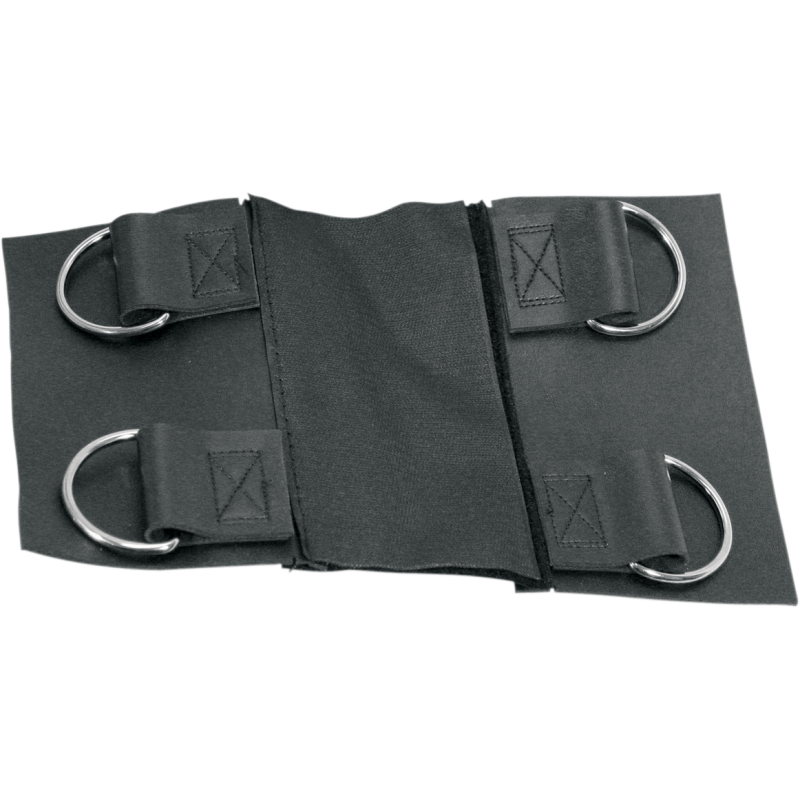 A black synthetic leather strap with chrome D-rings that slips under the passenger seat to provide four padded mounting points for bungee cords or nets, preventing scratches to paint or chrome.
