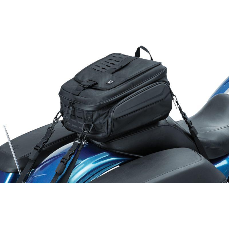 Versatile tail bag with a contoured bottom for a perfect fit on rear fenders or passenger seats. Includes an integrated shoulder strap that stows away, side-mounted quick-stash pockets, and a built-in coat flap. Thermoformed construction from 1680D textile with rain cover. Dimensions: 15" W x 15" D x 9.5" H. Measures: 1,530 cu. in. (25 L).