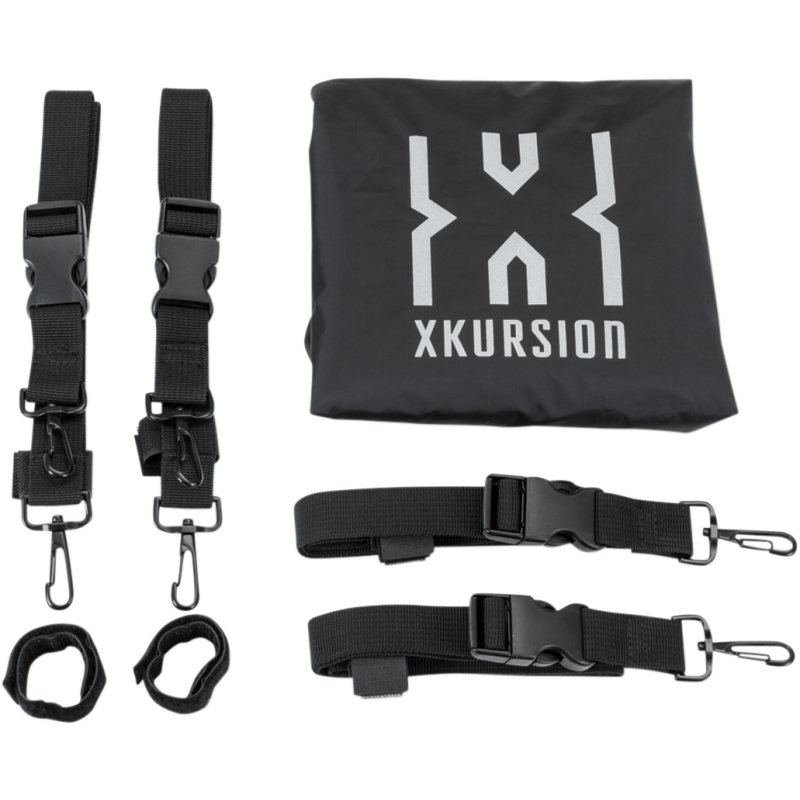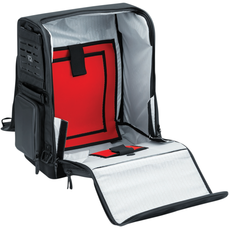 Features wide front hatch for easy access, formed bottom for secure mounting, high-strength sissy bar strap, media storage for laptops and tablets, and an external coat flap. Thermoformed construction from 1680D textile with rain cover. Dimensions: 16" W x 10" D x 20" H. Measures: 3,200 cu. in. (52 L).