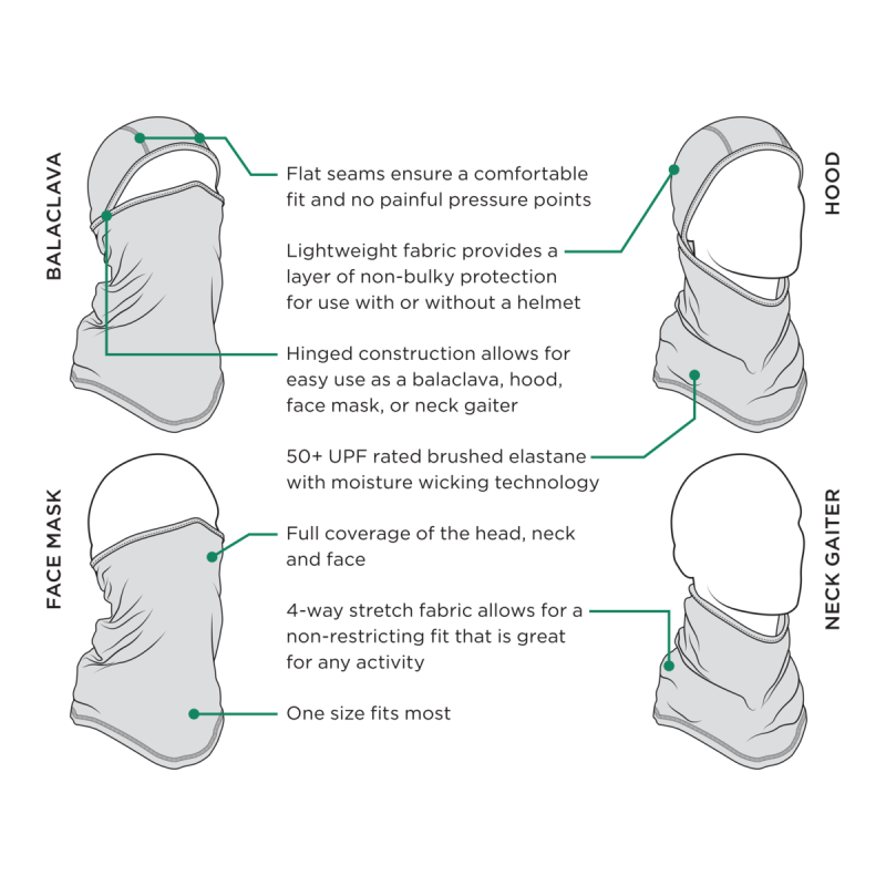 Versatile all-in-one balaclava construction. Heavier than standard polyester, lighter than fleece. Convertible wear. Provides warmth and protection. Machine washable. SportFlex™ fabric offers 50+ UV protection. 87% polyester, 13% elastane. One size fits most.